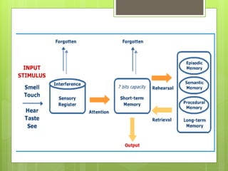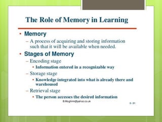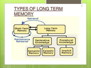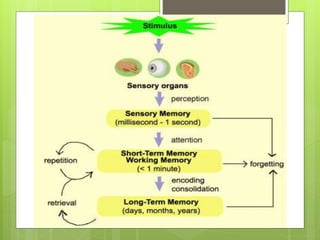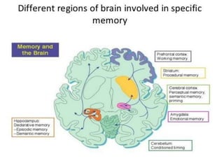 The document discusses the mechanisms of memory, emphasizing that memory involves various brain regions and that memories can be classified into types such as short-term, intermediate, and long-term. It explains the processes of synaptic facilitation and inhibition, highlighting how these processes contribute to the formation and recall of memories, as well as the distinction between positive and negative memories. Additionally, the role of the hippocampus in memory storage and the emotional significance of memories are explored.