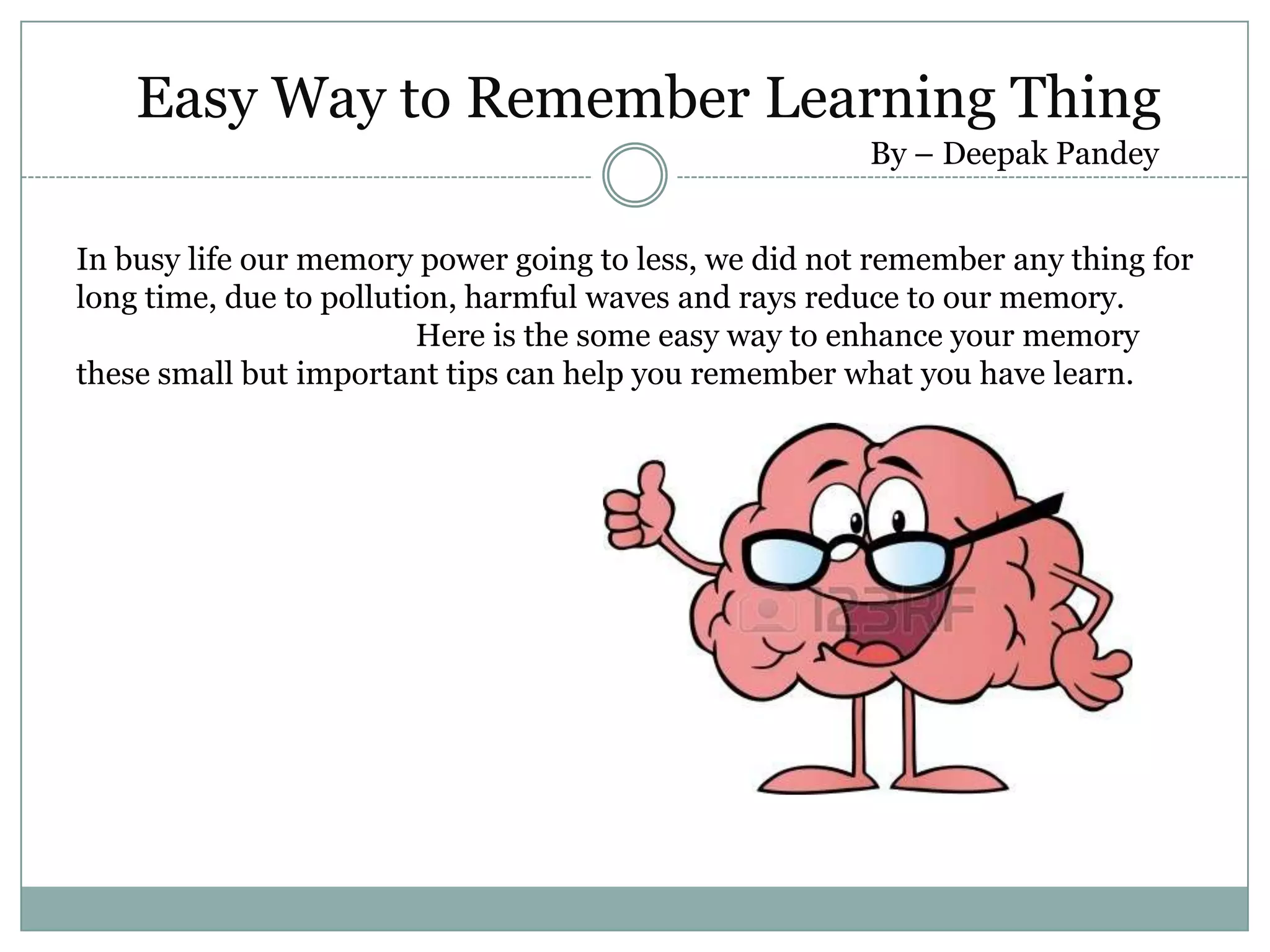 The document provides easy tips to enhance memory, stating that pollution and harmful waves reduce memory over time. It recommends telling others what you've learned to remember 90% and practicing the learned material to remember 75% as the top two methods. Group discussion can help remember 50% while demonstrating what you've learned recalls 30% and audio/visual technology recalls 20%. Reading recalls 10% and lectures only 5%.