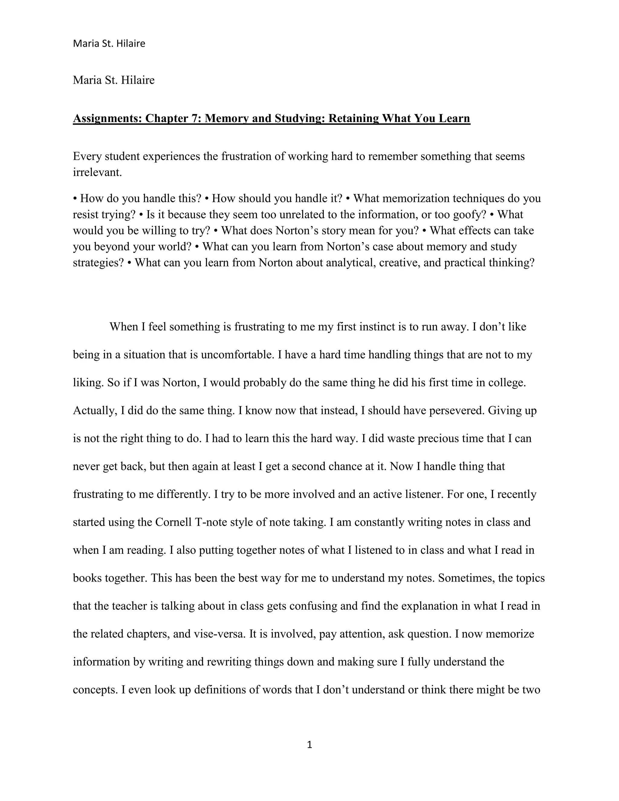 Maria St. Hilaire was assigned to read about memory and studying techniques. She had previously given up when frustrated but now tries different strategies like Cornell note-taking and making connections between topics. While resisting mnemonics and study groups, she is willing to try flashcards again. Norton's story motivates her by showing how determination leads to success through trying different strategies when initial failures occur. She aims to learn analytical, creative, and practical thinking from his example.