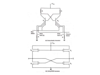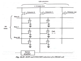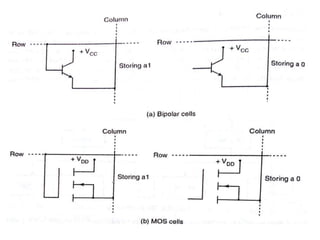 This document discusses different types of computer memory. It classifies memory as register, main memory, and secondary memory based on location. It also distinguishes between sequential access memory like tapes and random access memory like RAM. RAM is further divided into static and dynamic RAM. Memory is also classified as volatile and non-volatile based on whether data is retained when power is removed. ROM and RAM are discussed as examples of magnetic and semiconductor memory respectively. ROM is programmed during manufacturing and performs only read operations, while RAM allows both read and write.