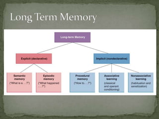 Short term memory activates the frontal lobe while long term memory activates the temporal lobe. Information flows one way from the cortex to the basal ganglia in an unconscious process without feedback to the neocortex, and dopamine is the major neurotransmitter. The medial temporal region including the hippocampus, amygdala, and entorhinal cortex are involved in memory, with the hippocampus specifically involved in spatial memory and the formation of mental maps.