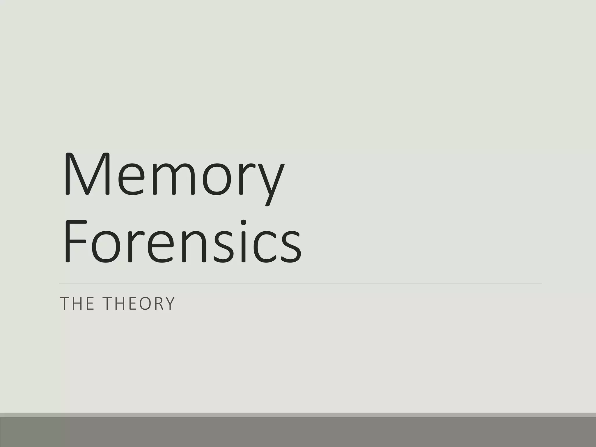 This document discusses computer memory forensics. It explains that memory forensics involves acquiring volatile memory contents from RAM and preserving them for later forensic analysis. The document outlines the different types of forensic analysis that can be performed on memory contents, including storage, file system, application, and network analysis. It also discusses the challenges of memory forensics, such as anti-forensic techniques used by malware to hide processes, drivers, and other artifacts in memory.