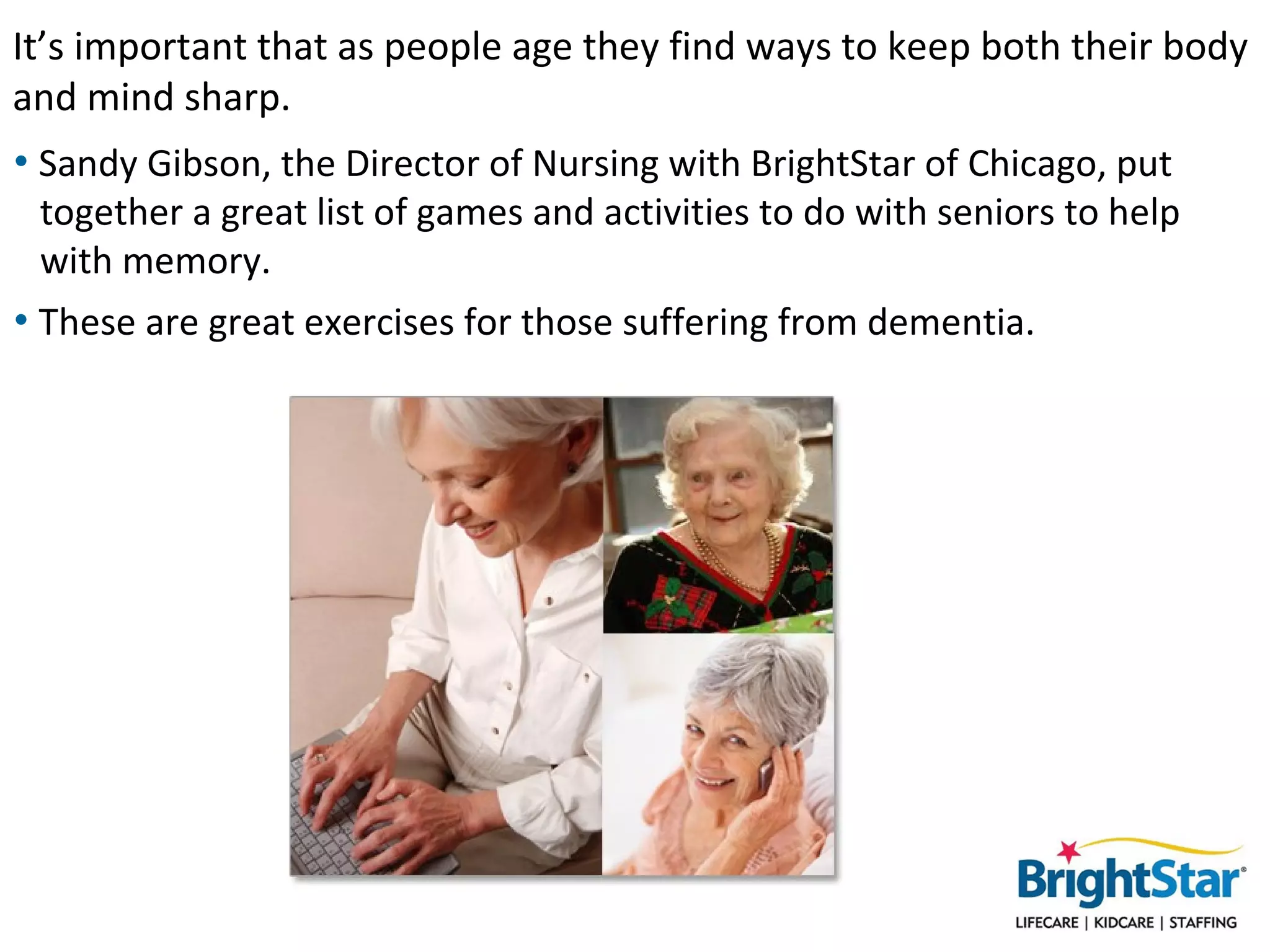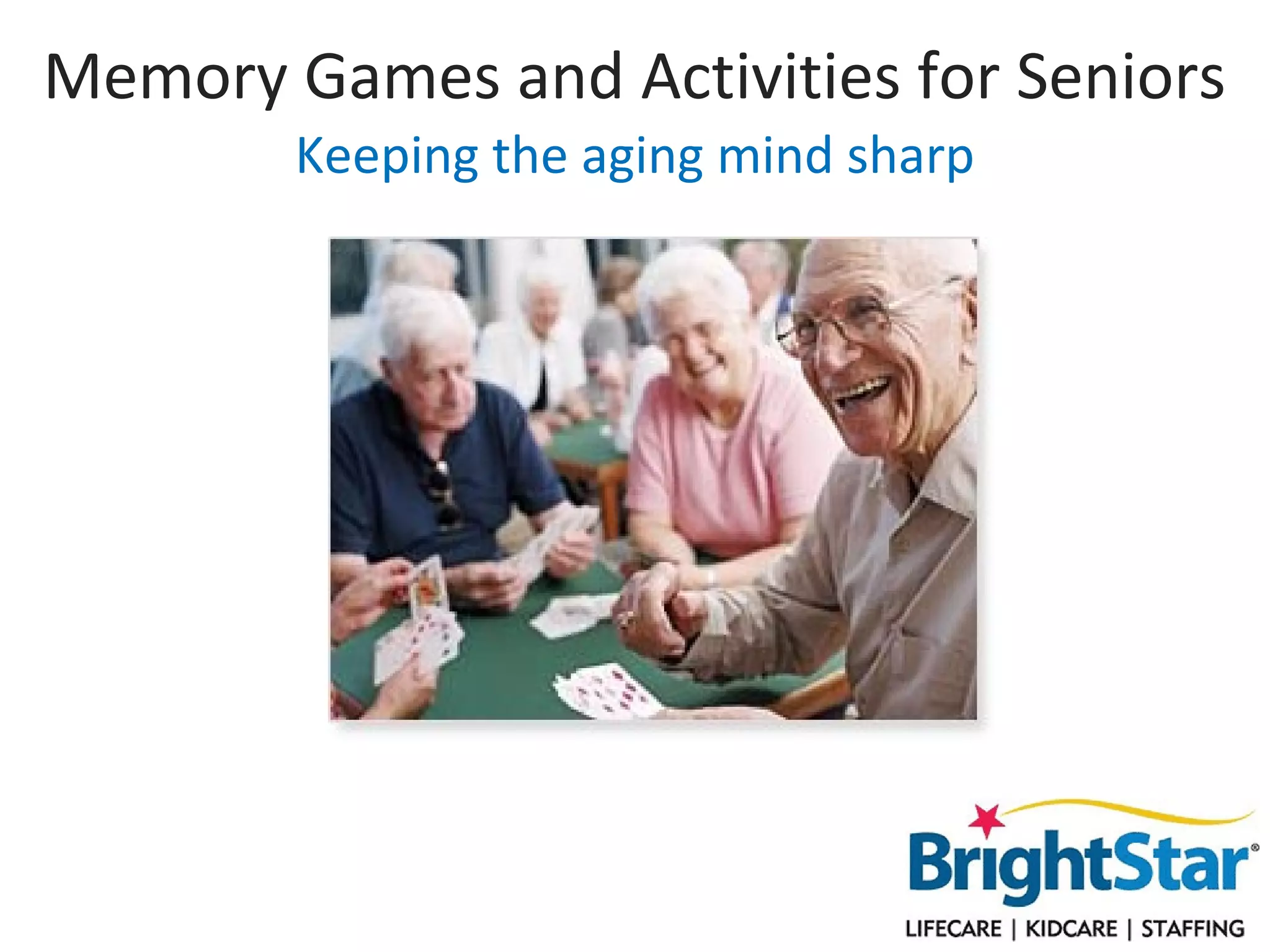 The document provides a comprehensive list of memory games and activities to help keep seniors' minds sharp, particularly for those experiencing dementia. Suggested activities include the memory card game, Simon Says, Name That Tune, and tech games, alongside traditional options like crossword puzzles and board games. These games not only enhance memory and cognitive skills but also promote social interaction and fun among seniors.