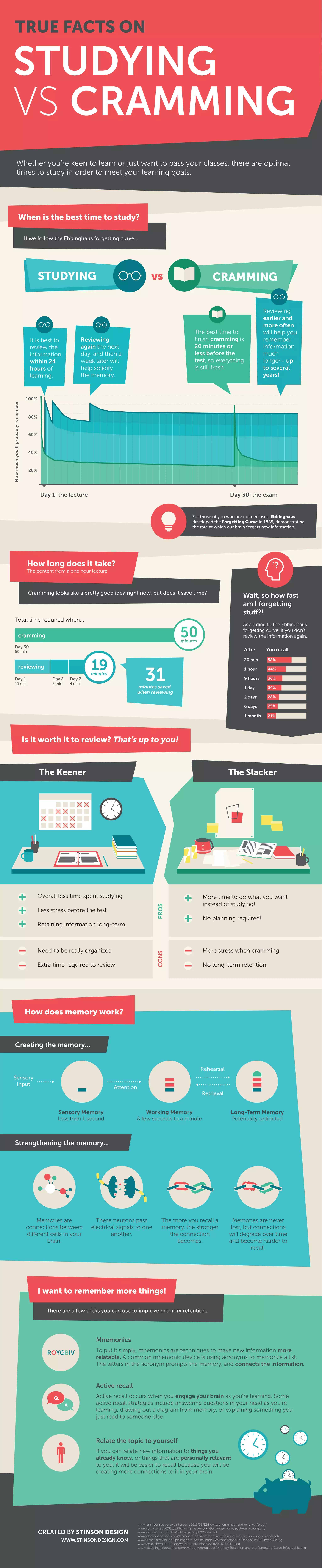 The document discusses optimal times for studying to improve memory retention. It recommends reviewing material within 24 hours of learning, and again after a day and a week. Cramming less than 20 minutes before a test risks poor long-term retention, while reviewing earlier and more often can help recall information for years. The forgetting curve shows recall drops off significantly within a day if not reviewed again.