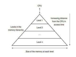 The document discusses computer memory hierarchy and input/output organization. It explains that memory is organized in a hierarchy with different levels that have varying speeds and sizes. The faster but smaller and more expensive memories (like CPU registers and cache) sit at the top, while the slower but larger and cheaper memories (like hard disks) sit at the bottom. This organization exploits the principle of locality, where data accessed recently is likely to be accessed again. It provides details on each level of memory and concepts like hit rate, miss rate, hit time and miss penalty in memory access.