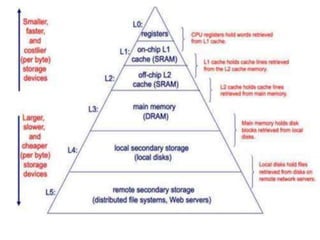 The document discusses memory hierarchy and I/O organization. It explains that memory hierarchy is structured with multiple levels of memory with different speeds and sizes. The faster levels closer to the CPU use SRAM while slower levels further use DRAM. The principle of locality states that programs access the same memory locations repetitively, improving cache hit rates. Memory hierarchy benefits from this by implementing faster cache levels backed by slower but larger memory levels.