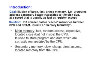 Levels of the memory hierarchy satisfy three key properties: the inclusion property where information moves from larger to smaller memories, the coherence property where copies stay consistent, and locality of references where frequently used data is stored closer to the CPU. The performance of a memory hierarchy depends on the effective access time which is determined by the hit ratio and access frequencies at different levels, where the hit ratio is the probability an item is found in that memory level.