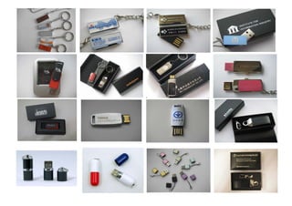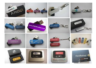 The document showcases various IT accessories including USB flash drives, wireless mice, and customized USB flash drives. The USB flash drives come in various colors, shapes, and packaging and range in storage sizes from 2GB to 8GB. Wireless mice options include a rechargeable slim mouse and a wireless drive mouse. Customized USB flash drives can be ordered with custom logos or designs.