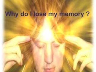 Stress, negative experiences, and lack of sleep can cause memory loss. Some tips to improve memory include finding new activities, sitting up straight, drinking water, laughing, eating healthy food, and taking courses to challenge the mind. Being positive can also help memory.