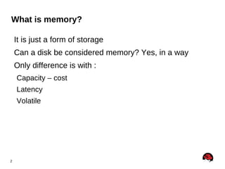 The document discusses Linux memory management, describing how physical memory is divided into page frames and virtual memory allows processes to have a virtual view of memory mapped to physical memory using page tables, and covers topics like memory overcommit, page cache, swap space, and tools for monitoring memory usage.