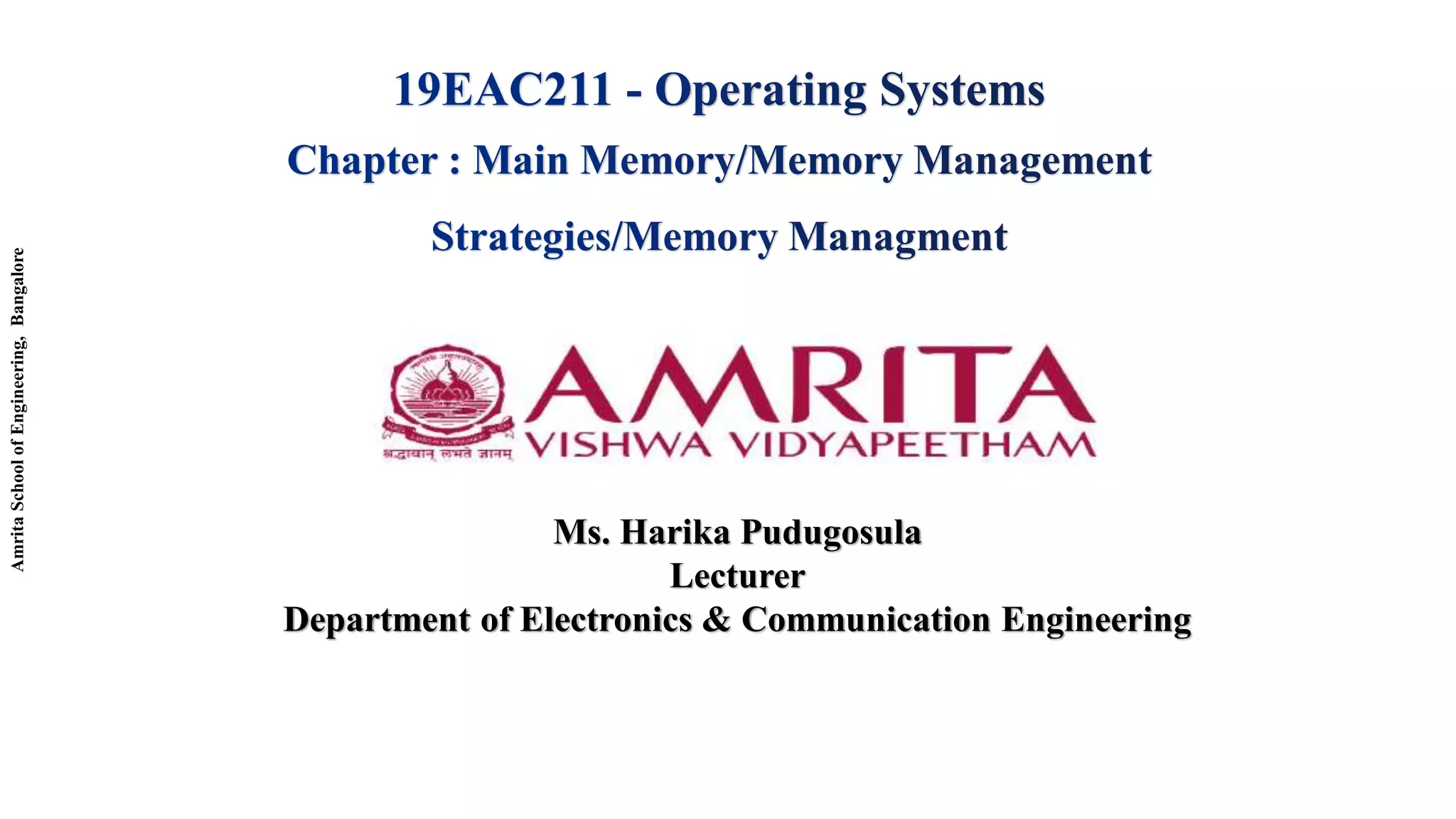 The document discusses memory management techniques in computer systems, focusing on methods like hierarchical paging, hashed page tables, and inverted page tables to efficiently handle large page tables in modern operating systems. It highlights the challenges of contiguous memory allocation for page tables and presents solutions to reduce memory usage while improving performance. Key examples and figures are provided to illustrate two-level paging schemes and hashing mechanisms for address translation.
