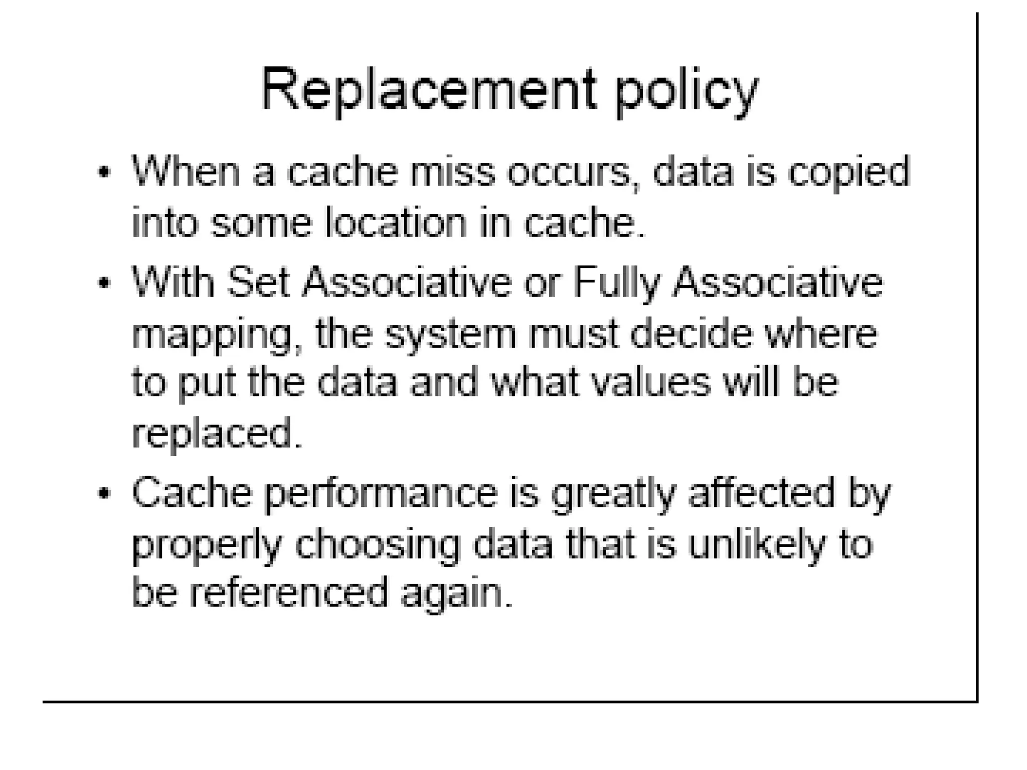 • Write Policy - Replacement Algorithm when blocks