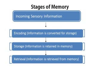 Memory is the process of encoding, storing, and retrieving information and consists of sensory memory, short-term memory, working memory, and long-term memory. Long-term memory is further classified into declarative (semantic and episodic) and procedural memory, with retrieval influenced by various effects such as primacy and recency, as well as factors leading to forgetting. Memory dysfunctions can include conditions like Alzheimer's and amnesia, while techniques for improving memory include better processing methods.