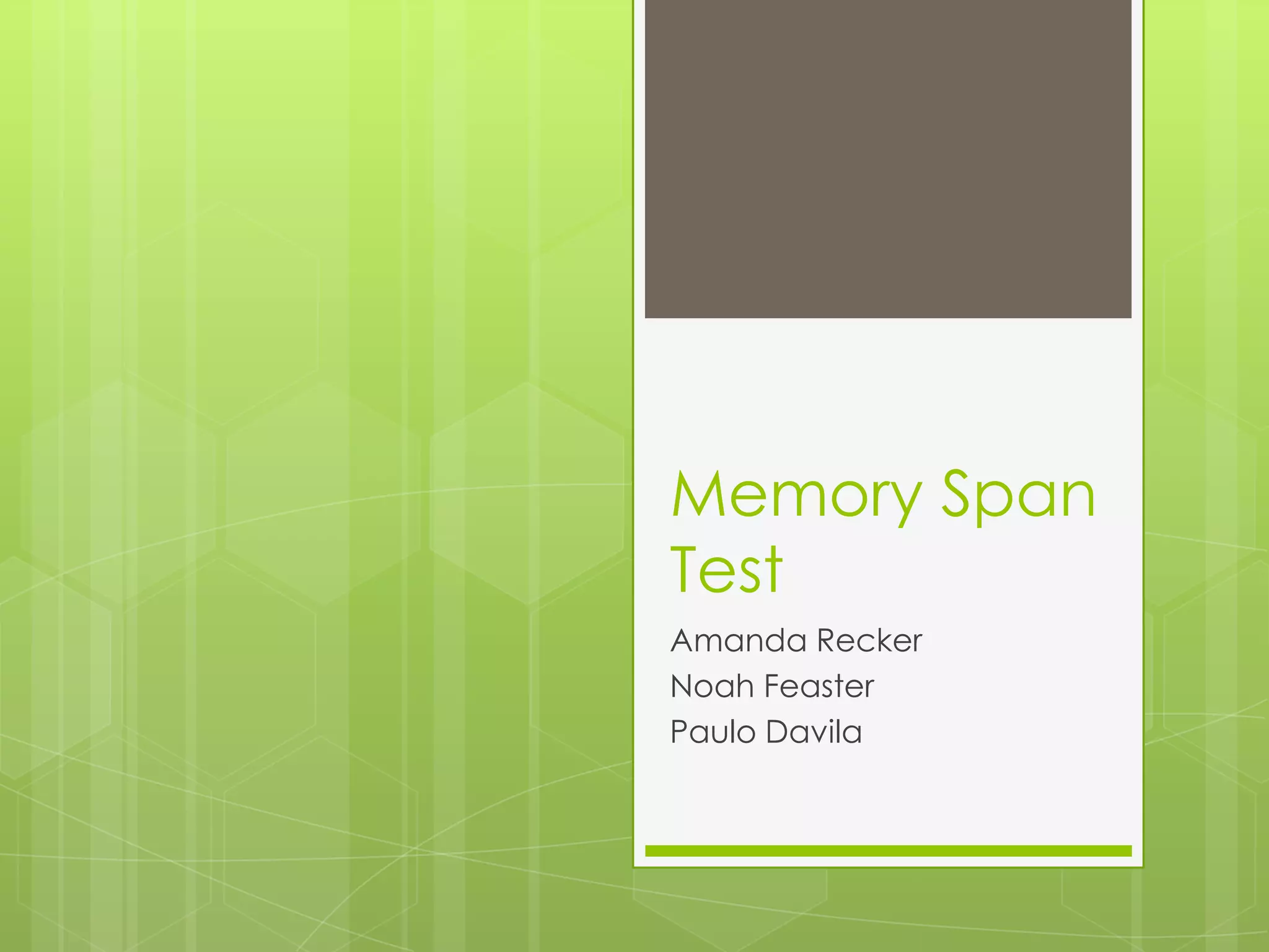 The document summarizes three memory span experiments conducted by Amanda, Noah, and Paulo. Amanda found a significant correlation between perceived stress and memory span. Noah found no significant difference in memory span between high and low GPA groups. Paulo found no significant impact of proactive interference on memory span. The conclusion discusses limitations and need for further research.