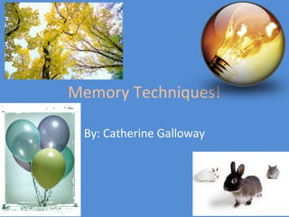 This document discusses different memory techniques including rote memory, acronyms, stories, color, rap, and movement. It recommends using color as a memory technique, noting that drawing lessons with color pencils rather than regular pencils helps get the brain to pay attention to what is being studied.