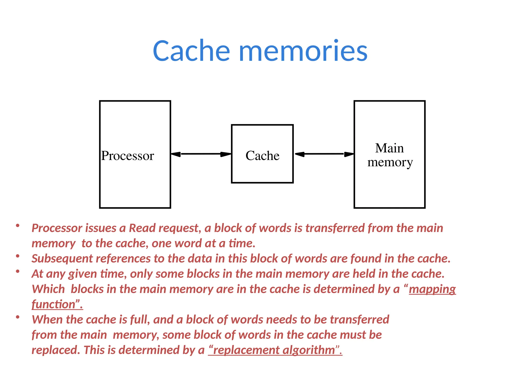 • When the cache is full, and a block of words needs to be transferred