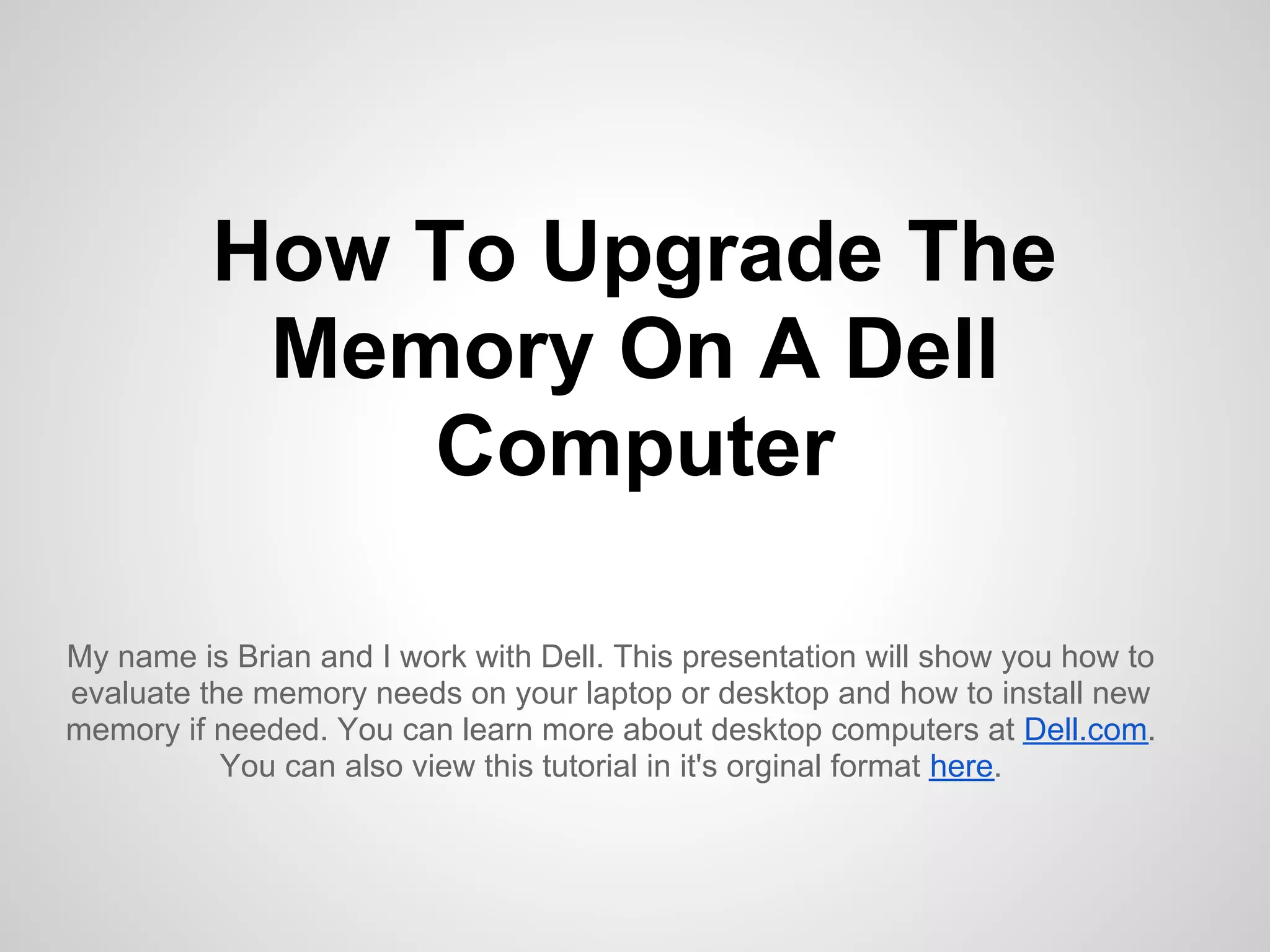 This document provides instructions for upgrading the memory on a Dell computer by checking the current memory configuration, capacity, choosing new memory that meets needs, purchasing it, and inserting and installing the new memory.