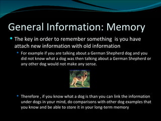 The document discusses various techniques for improving memory and recall of information. It explains that new information must be linked to existing knowledge in long-term memory in order to be remembered. Specific techniques mentioned include using mnemonics to remember lists through creative word associations, summarizing information to reduce it to main topics and ideas, reciting information aloud or on recordings, and using colors and visual aids to better organize and retain information.