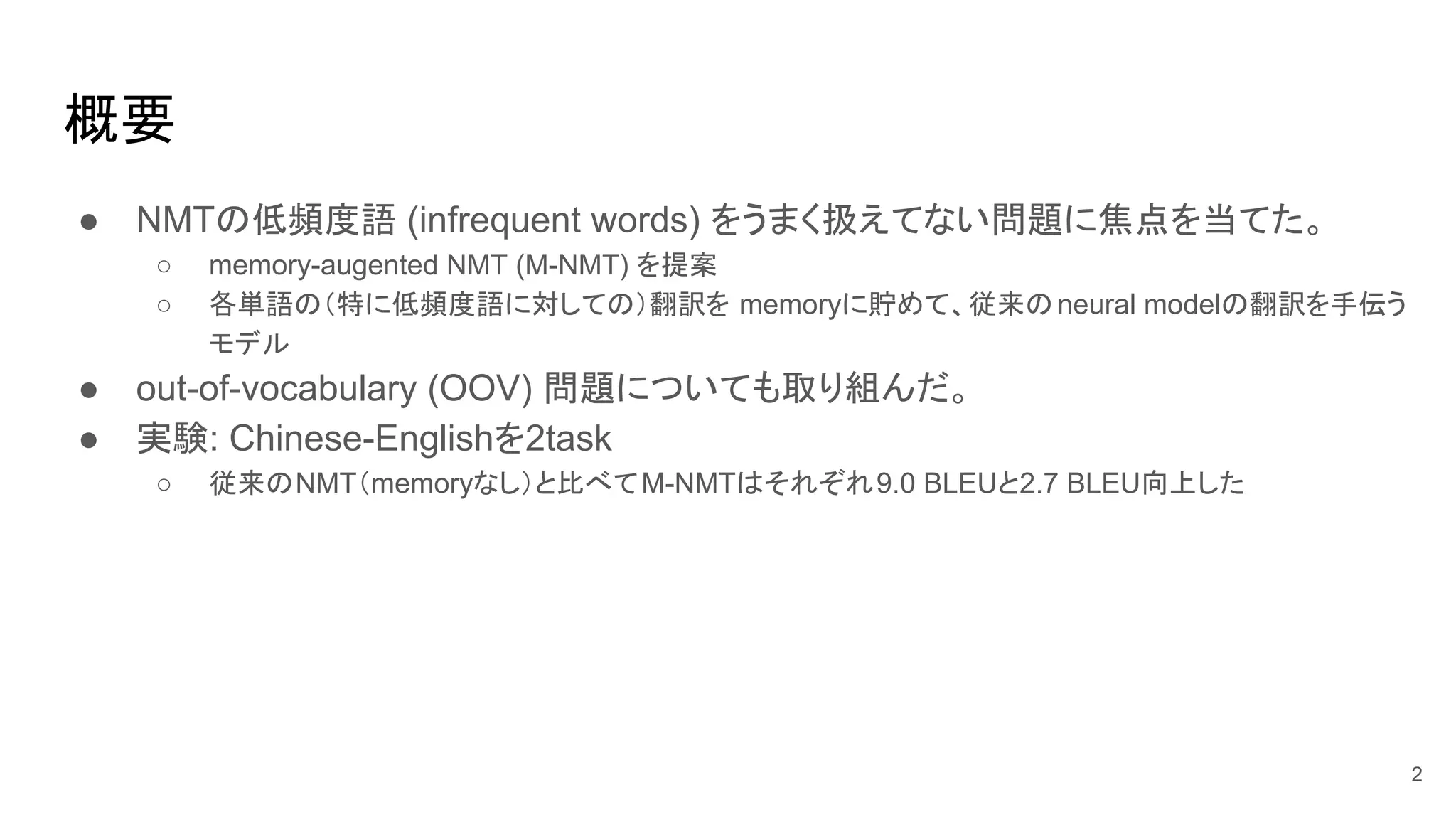 ● NMTの低頻度語 (infrequent words) をうまく扱えてない問題に焦点を当てた。