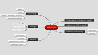 Memory involves three main stages: encoding, storage, and retrieval. Encoding involves receiving and processing information, storage creates a permanent record of encoded information, and retrieval recalls stored information in response to cues. There are two main types of long-term memory: explicit memory which involves consciously recalling facts and experiences, and implicit memory which unconsciously influences behavior through procedural and non-declarative memories. Memory is stored throughout the brain in overlapping neural networks rather than isolated files.