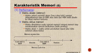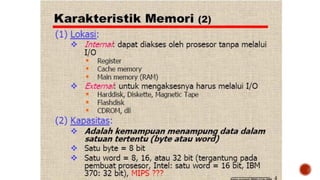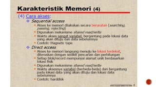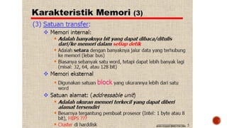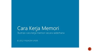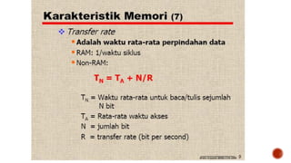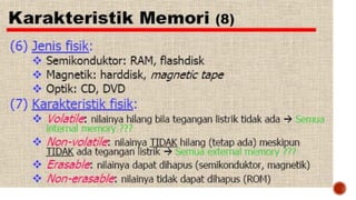 Memori komputer merujuk pada media penyimpanan data sementara yang digunakan untuk menyimpan program dan data yang sedang diproses. Data akan hilang ketika komputer dimatikan kecuali disimpan ke media permanen. Jenis memori yang umum digunakan adalah RAM yang menyimpan data secara dinamis.