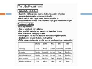 This document discusses the course ME407 Mechatronics. The course objectives are to introduce various sensors used in machines and robots, study MEMS pressure and inertial sensors, and develop hydraulic/pneumatic circuits and PLC programs. The expected outcomes are for students to understand mechanical systems in mechatronics and integrate mechanical, electronic, control and computer engineering in design. The syllabus covers introduction to mechatronics, sensors, actuators, MEMS, and case studies. Fabrication of MEMS is also discussed, including deposition, patterning using photolithography, and etching processes.