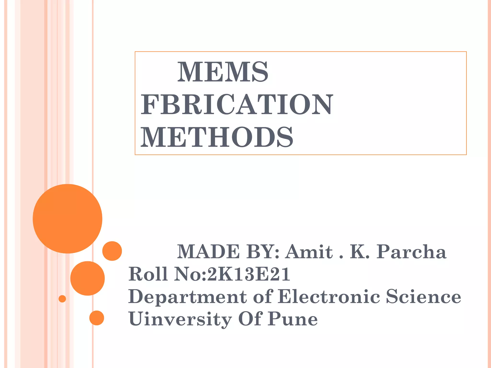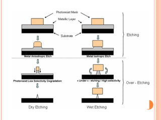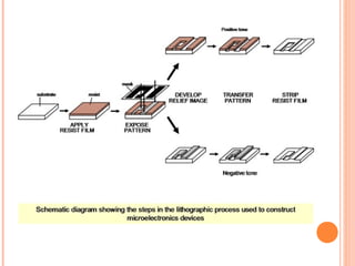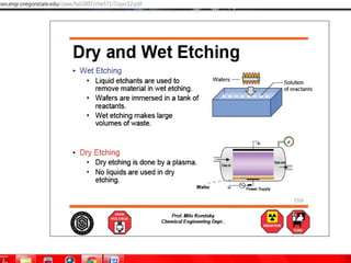 This document discusses microelectromechanical systems (MEMS) fabrication methods. It covers common MEMS fabrication processes like deposition, lithography, and etching. Deposition methods include chemical vapor deposition and physical vapor deposition to deposit thin films. Lithography involves transferring patterns to photosensitive materials using masks and radiation exposure. Etching is used to selectively remove materials, including wet etching using chemicals and dry etching using reactive ions. The document also discusses challenges with MEMS packaging, limited prototyping and manufacturing options, and the need for improved design tools.