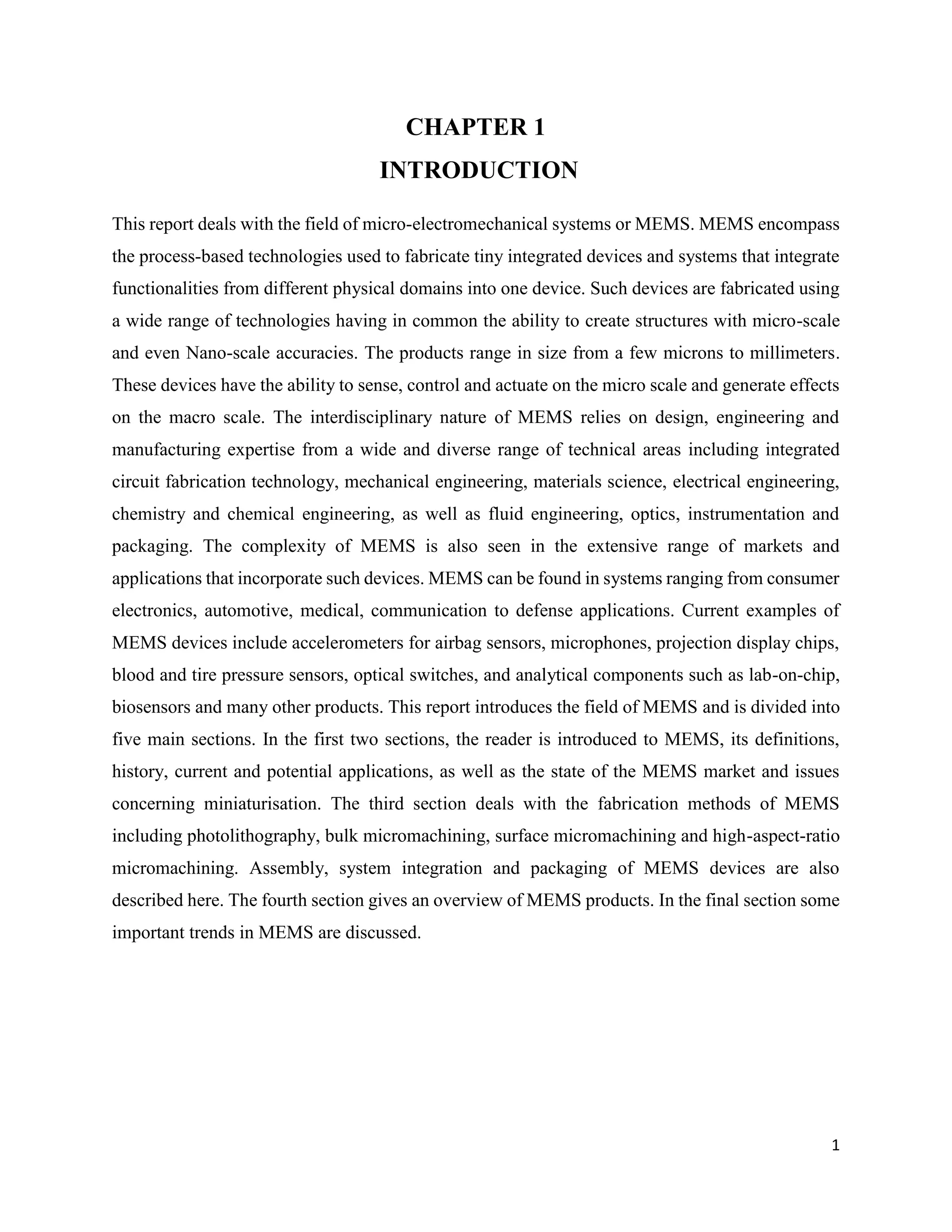 This document provides an introduction to micro-electromechanical systems (MEMS). MEMS integrate functionalities from different physical domains into tiny devices fabricated using microscale and nanoscale processes. MEMS devices range in size from a few microns to millimeters and can sense, control, and actuate on the microscale while generating macroscale effects. The document discusses the history, definitions, applications, fabrication methods, products, and trends of MEMS.