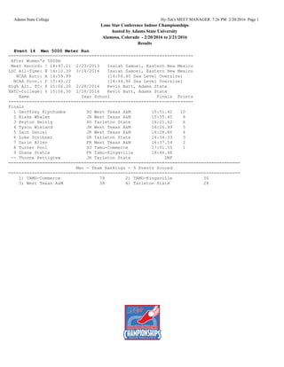 The document is a results summary from the Lone Star Conference Indoor Championships men's 5000 meter run event. Geoffrey Kipchumba from West Texas A&M won the event with a time of 15:51.42. In second place was Blake Whalen from West Texas A&M with a time of 15:55.45. The meet records and qualifying standards for NCAA and conference competitions are also listed.
