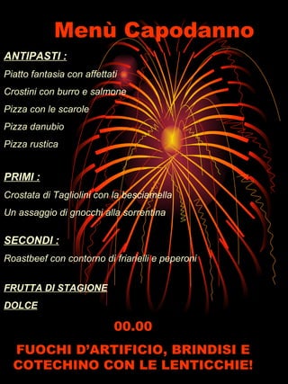 Il menù di Capodanno include una varietà di piatti tra cui antipasti di affettati e crostini, diverse pizze, e primi come tagliolini e gnocchi. I secondi piatti comprendono roastbeef servito con friarielli e peperoni. La celebrazione prevede anche fuochi d'artificio, brindisi e tradizionali cotechino con lenticchie.