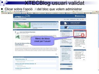 Menú Deines De Bloc Xtec Blog 1. 2. Clicar sobre l’opció del bloc que volem administrar XTECBlog usuari validat Menú de blocs creat per l’usuari 3. 4. XTECBloc pantalla opció importa Aquesta opció ens permet importar al nostre bloc articles realitzats des de diferents llocs Per importar des de altre bloc WordPress o XTECBloc clica aquí Per importar des de un bloc de Blogger clica aquí 5. XTECBloc pantalla opció exporta Aquesta opció ens permet exportar els articles realitzats al nostre bloc per importar-los a altres blocs Per exportar els articles clica aquí Per exportar els articles d’un determinat usuari pots utilitzar aquest filtre