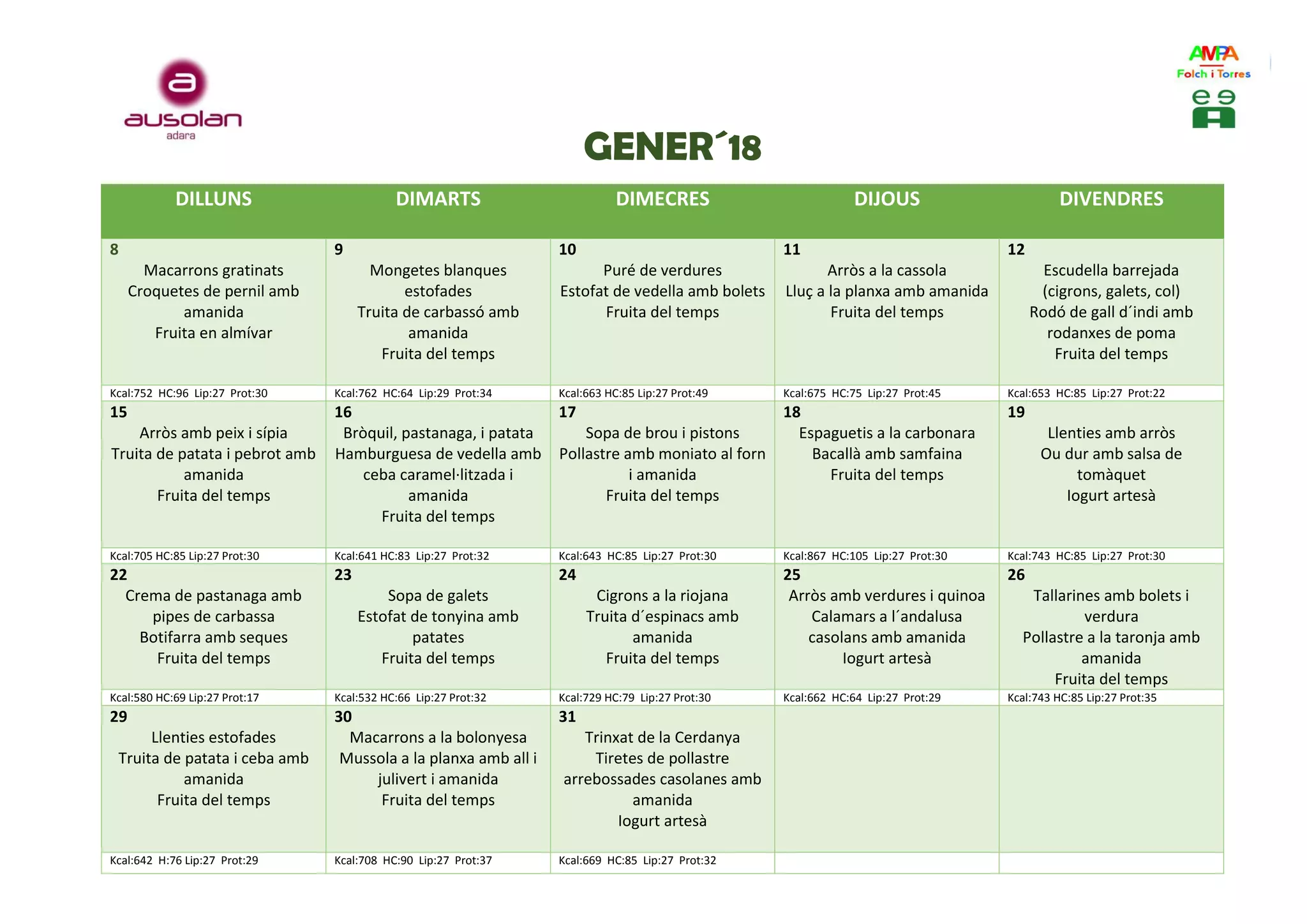 Kcal:642 H:76 Lip:27 Prot:29 Kcal:708 HC:90 Lip:27 Prot:37 Kcal:669 HC:85 Lip:27 Prot:32