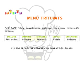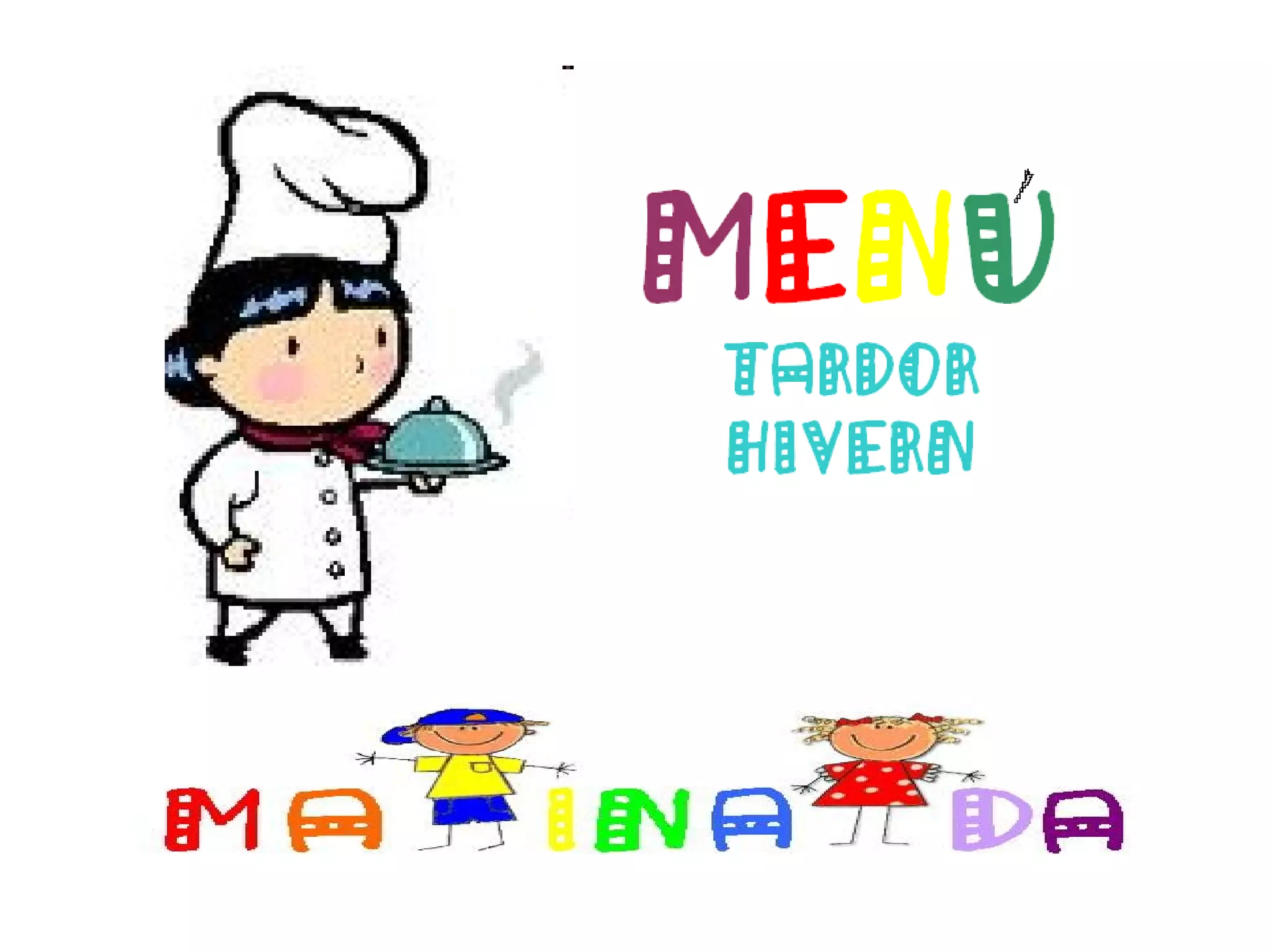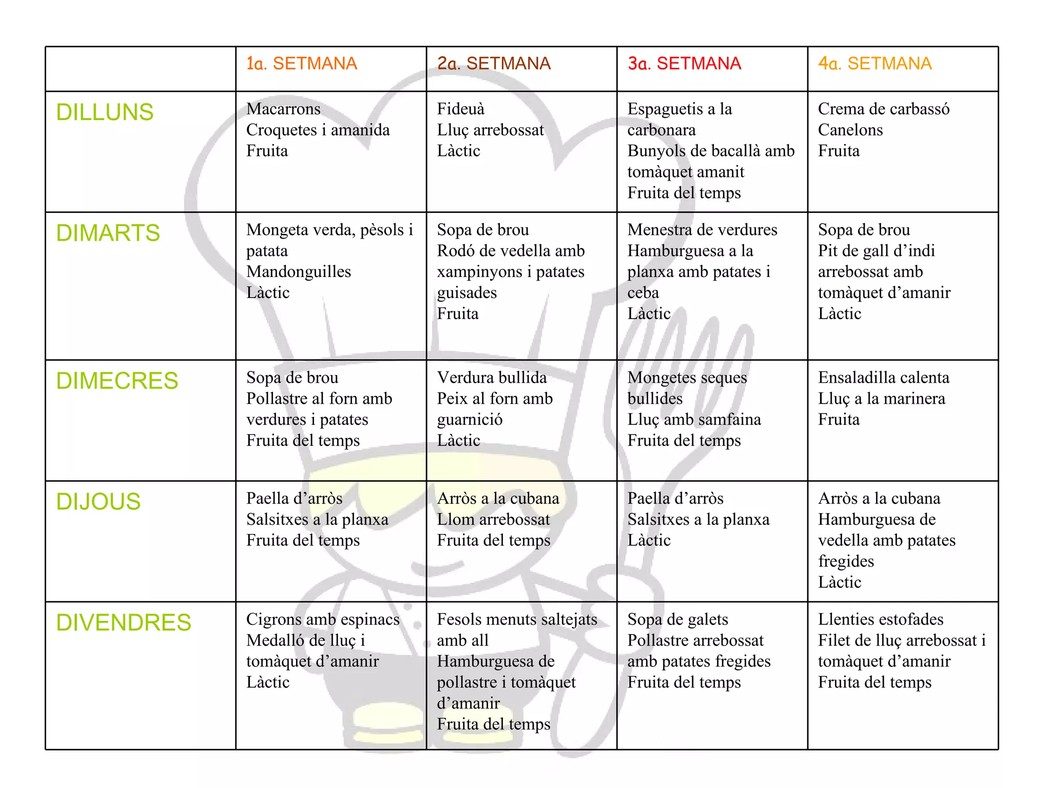 Llenties estofades Filetde lluç arrebossat i tomàquet d’amanir Fruita del temps Sopa de galets Pollastre arrebossat amb patates fregides Fruita del temps Fesols menuts saltejats amb all Hamburguesa de pollastre i tomàquet d’amanir Fruita del temps Cigrons amb espinacs Medalló de lluç i tomàquet d’amanir Làctic DIVENDRES Arròs a la cubana Hamburguesa de vedella amb patates fregides Làctic Paella d’arròs Salsitxes a la planxa Làctic Arròs a la cubana Llom arrebossat Fruita del temps Paella d’arròs Salsitxes a la planxa Fruita del temps DIJOUS Ensaladilla calenta Lluç a la marinera Fruita Mongetes seques bullides Lluç amb samfaina Fruita del temps Verdura bullida Peix al forn amb guarnició Làctic Sopa de brou Pollastre al forn amb verdures i patates Fruita del temps DIMECRES Sopa de brou Pit de gall d’indi arrebossat amb tomàquet d’amanir Làctic Menestra de verdures Hamburguesa a la planxa amb patates i ceba Làctic Sopa de brou Rodó de vedella amb xampinyons i patates guisades Fruita Mongeta verda, pèsols i patata Mandonguilles Làctic DIMARTS Crema de carbassó Canelons Fruita Espaguetis a la carbonara Bunyols de bacallà amb tomàquet amanit Fruita del temps Fideuà Lluç arrebossat Làctic Macarrons Croquetes i amanida Fruita DILLUNS 4a . SETMANA 3a . SETMANA 2a . SETMANA 1a . SETMANA