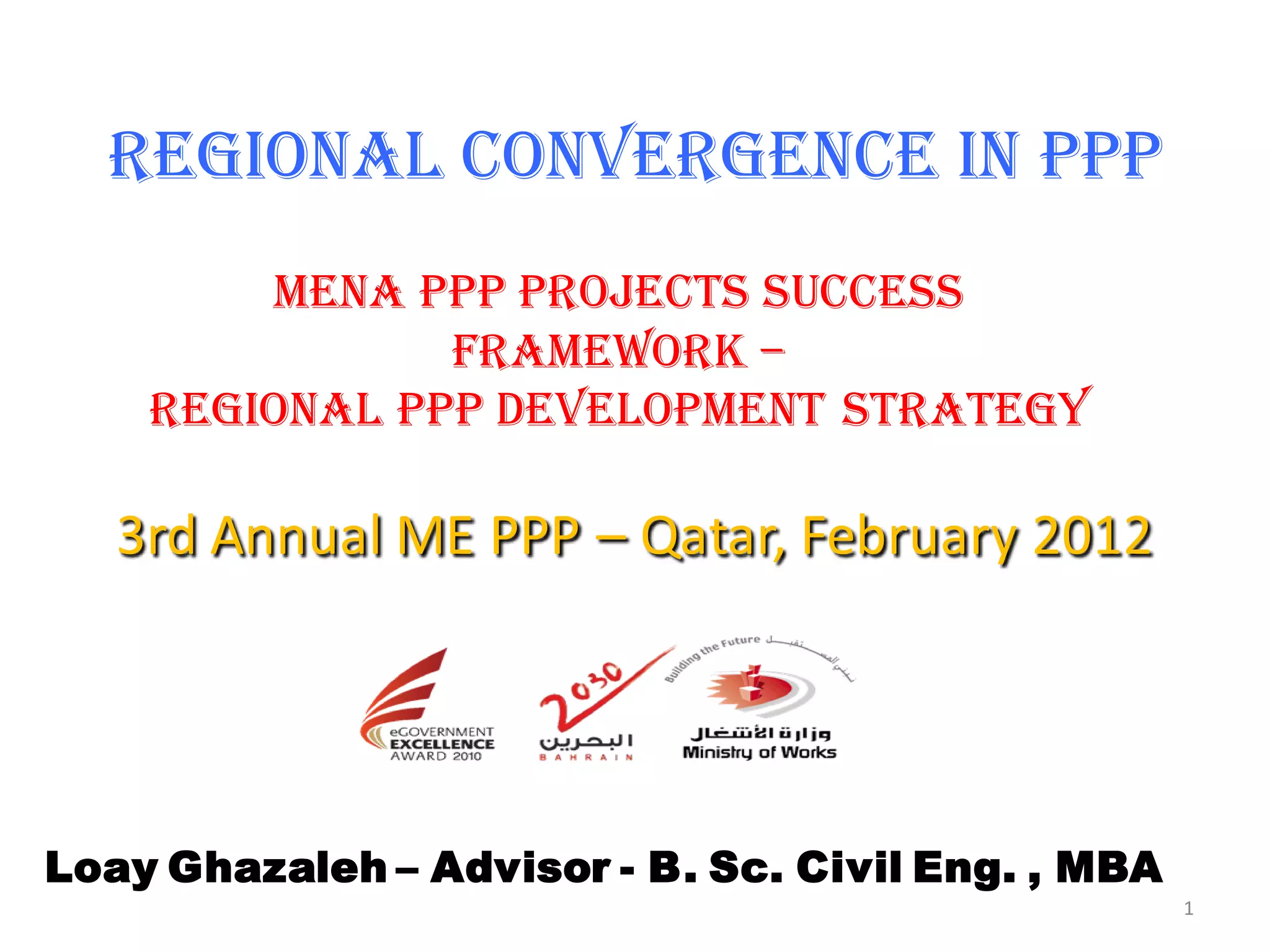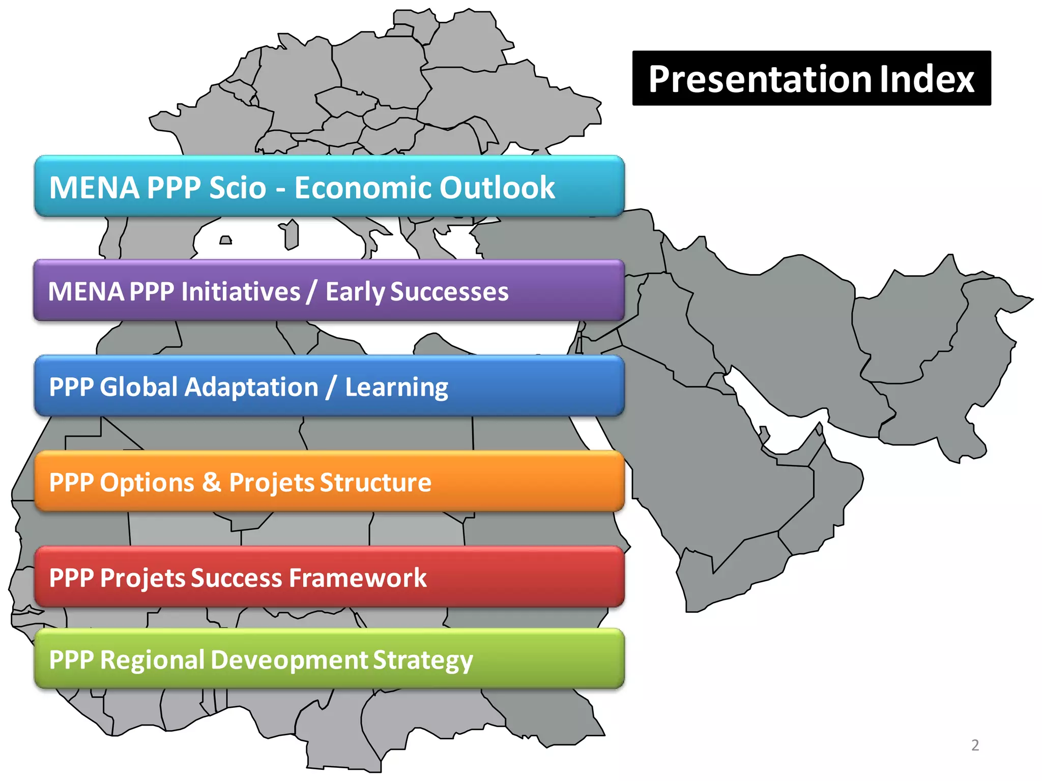 The document discusses the challenges and opportunities for public-private partnerships (PPP) in the Middle East and North Africa (MENA) region, focusing on the need for significant investment in infrastructure to meet growing demands. It highlights the importance of PPP in delivering efficient project outcomes and the necessity for regulatory frameworks to support these initiatives. Additionally, it provides an overview of various infrastructure projects and government initiatives across MENA countries aimed at addressing key economic and social needs.