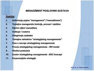 Dokument analizira menadžment poslovnih sustava, uključujući definiciju menadžmenta, temeljne funkcije i vještine menadžera, kao i važnost vođenja, delegiranja zadataka i strategijskog menadžmenta. Ističe se značaj pravilnog delegiranja zadataka kako bi se povećala efikasnost i postigli organizacijski ciljevi, uz naglasak na ulogu povjerenja između menadžera i zaposlenika. Ključni ciljevi menadžera obuhvaćaju vođenje, efikasnost, etiku i odgovornost prema društvu.