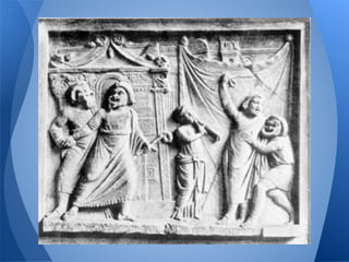 This document discusses masks used by slaves in New Comedy plays from Pergamon. It references a book on the history of Greek and Roman theater from 1971 that contains figures of the masks on pages 89 and 102. The masks were worn by slaves in plays, possibly including those written by Aristophanes.