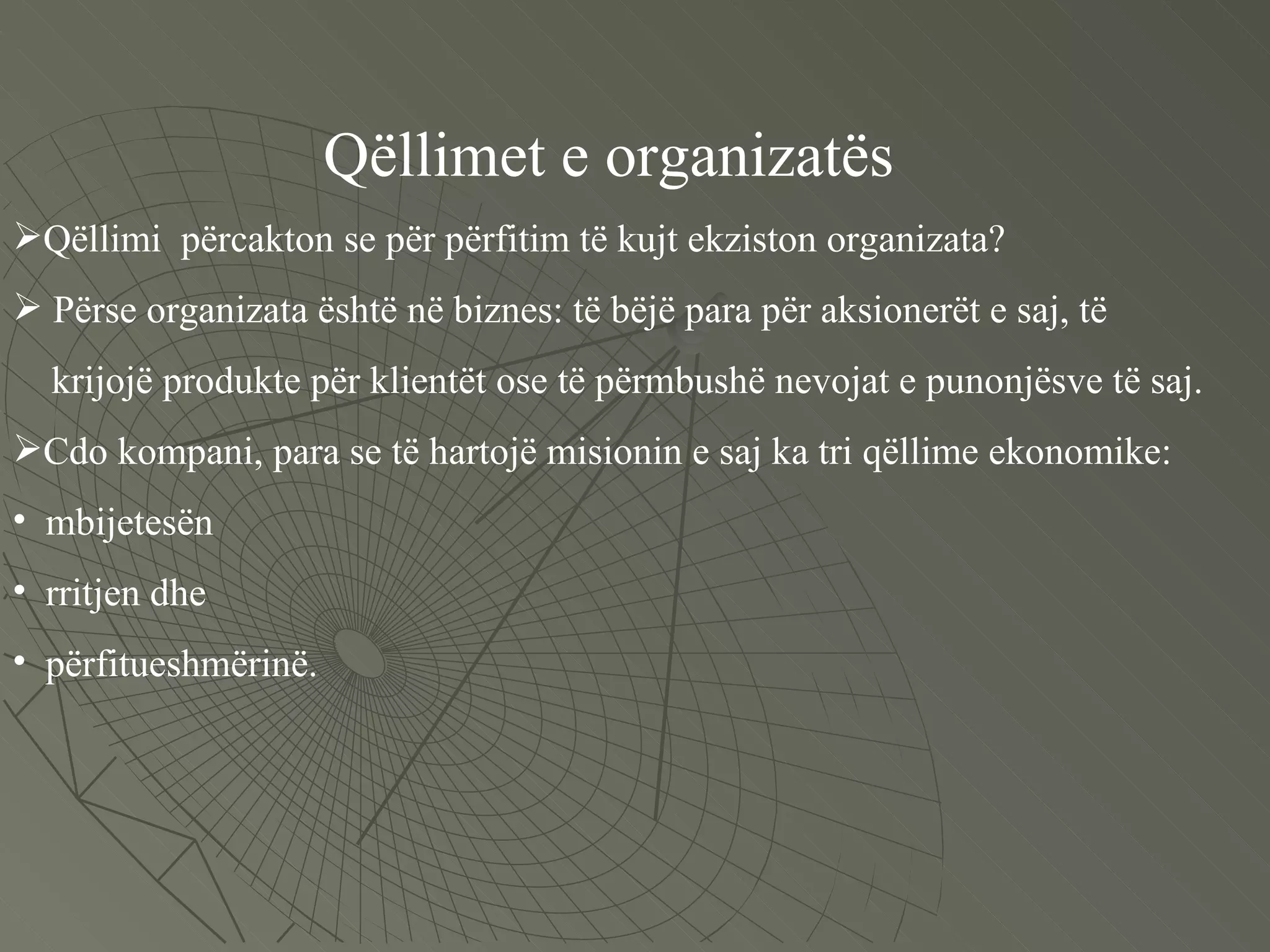Qëllimet e organizatësQëllimi përcakton se për përfitim të kujt ekziston organizata? Përse organizata është në biznes: të bëjë para për aksionerët e saj, të krijojë produkte për klientët ose të përmbushë nevojat e punonjësve të saj. Cdo kompani, para se të hartojë misionin e saj ka tri qëllime ekonomike: mbijetesën rritjen dhe përfitueshmërinë.
