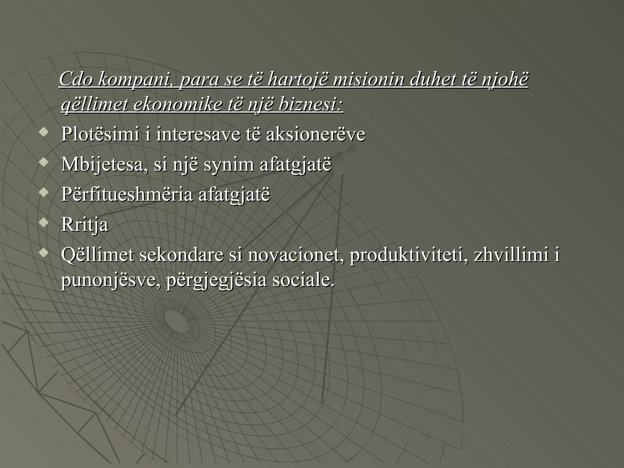 Cdo kompani, parase të hartojë misionin duhet të njohë qëllimet ekonomike të një biznesi: Plotësimi i interesave të aksionerëve Mbijetesa, si një synim afatgjatë Përfitueshmëria afatgjatë Rritja Qëllimet sekondare si novacionet, produktiviteti, zhvillimi i punonjësve, përgjegjësia sociale.