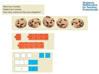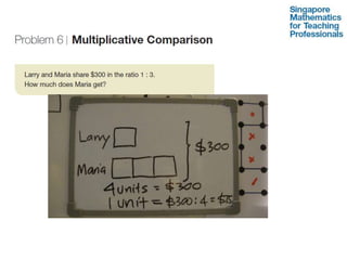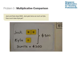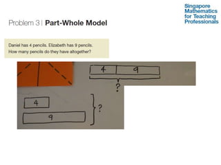 The document discusses the model method for teaching mathematics in lower primary education, emphasizing various strategies for problem-solving and visualization. It presents examples of calculations involving units and methods to determine relationships between numbers, as well as concepts like the part-whole model and mental computation. Additionally, it highlights the role of parents in coaching children to develop their own understanding of math through support and guided practice.