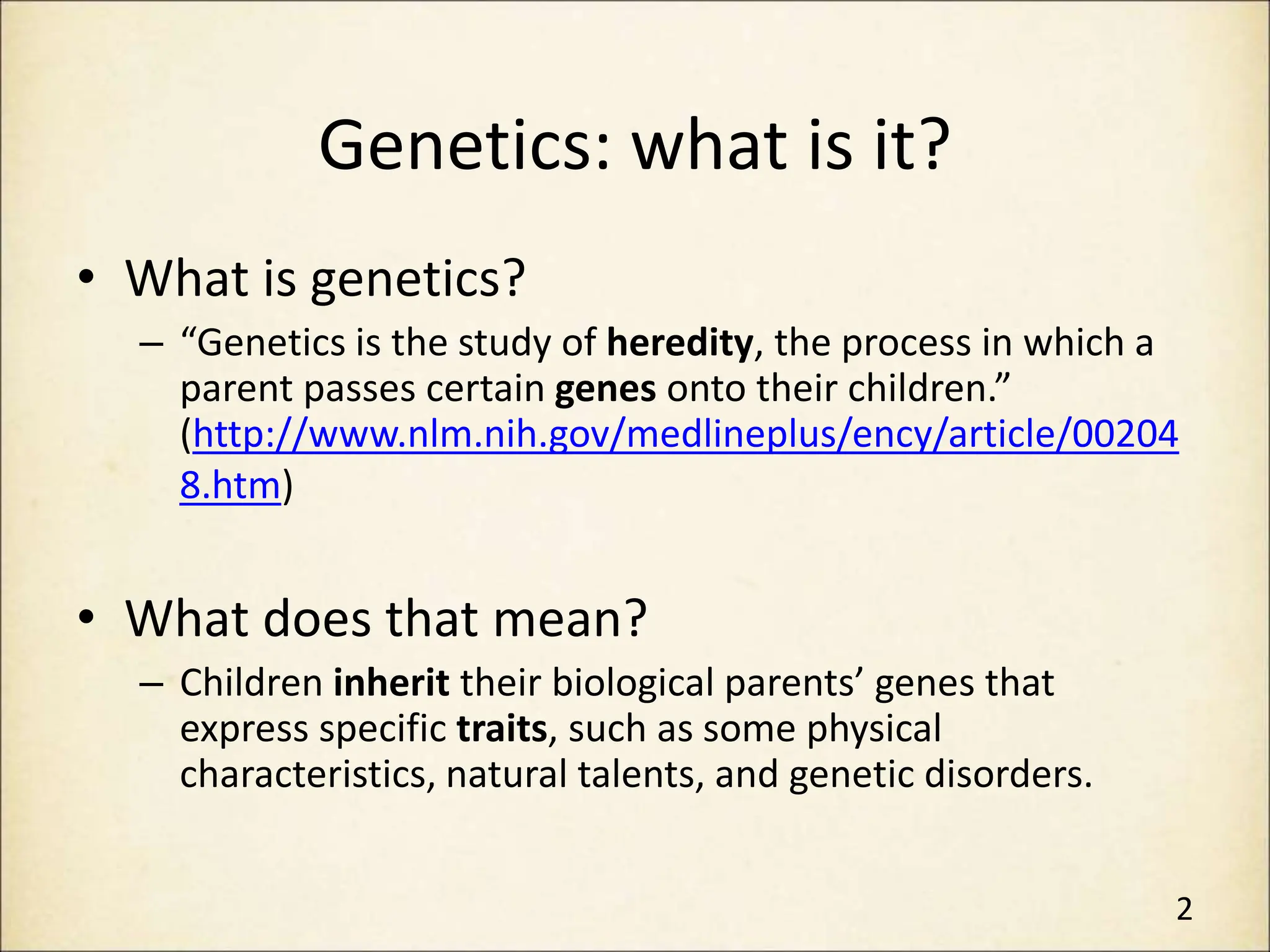 Genetics is the study of heredity, or how biological traits are passed from parents to children through genes. Genes are sections of DNA found on chromosomes. Humans have two sets of 23 chromosomes, one set inherited from each parent. Traits are expressed through dominant or recessive alleles, and a person's genotype is their combination of alleles, which determines their observable phenotype. Mendelian inheritance describes how genetic traits are determined based on the genes inherited from each parent.