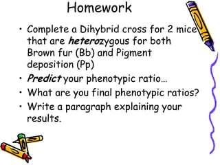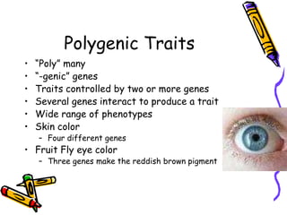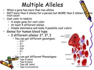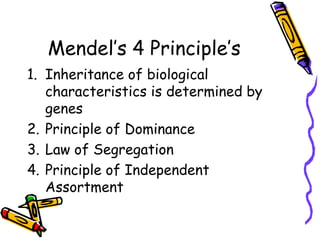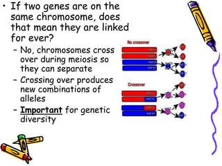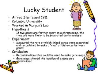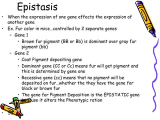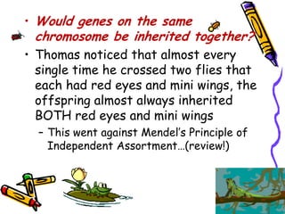 This document discusses Gregor Mendel's principles of inheritance and genetics. It covers Mendel's laws of segregation, dominance, and independent assortment. It also discusses exceptions to Mendelian genetics like incomplete dominance, codominance, multiple alleles, polygenic traits, epistasis, and gene linkage. Thomas Hunt Morgan's work with fruit flies provided evidence that genes are located on chromosomes, not assorting independently as Mendel believed, but rather assorting as linked genes on the same chromosome. Gene mapping using recombination rates helped establish the chromosomal theory of inheritance.
