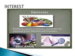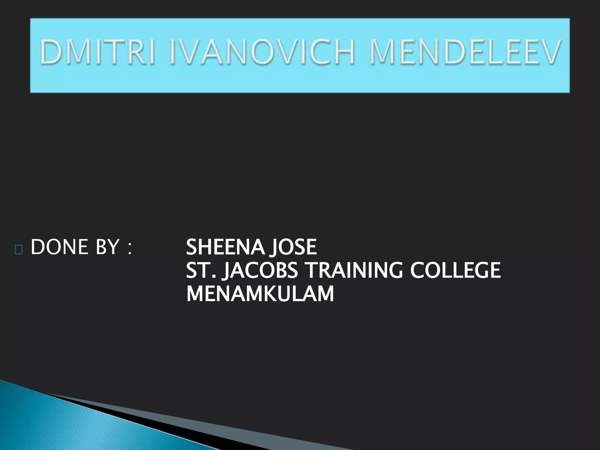 Dmitri Mendeleev was a Russian chemist born in 1834. He studied chemistry and graduated from St. Petersburg University in 1856. After graduating, he became a professor and was considered one of the greatest chemistry teachers of his time. Mendeleev is most famous for creating the first version of the periodic table of elements in 1869, in which he arranged the elements based on their atomic weights and properties. Using his periodic table, he was able to predict the properties of elements that had not yet been discovered. The periodic table became widely accepted among chemists and helped advance the field of chemistry. Mendeleev received several honors for his work, including the Copley Medal, and element 101 was named Mende