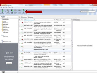Mendeley is a citation manager that allows users to build a personal database of research articles, organize and annotate the articles, and generate citations in various styles. It offers both desktop and online versions that automatically sync. Users can import articles, organize them in a library, highlight and take notes, generate citations, and collaborate with other researchers by inviting them to join groups. Mendeley has pros like compatibility across platforms and automatic syncing, but cons include limited free storage and inability to annotate on the app. It has practical applications for dietetic interns in researching client questions and building an organized personal database.