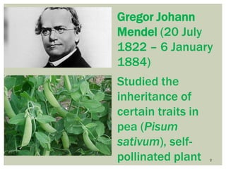 Gregor Mendel conducted experiments with pea plants to study inheritance of traits. In monohybrid crosses involving one trait like flower color, he found that one factor (red color) dominated the recessive trait (white color) in the offspring (F1 generation). When the F1 plants were self-pollinated to produce F2 offspring, there was a 3:1 ratio of dominant to recessive traits. In dihybrid crosses involving two traits like seed shape and color, the F1 offspring exhibited dominant traits for both. The F2 offspring showed a 9:3:3:1 ratio for different combinations of traits. Mendel's experiments established basic principles of heredity and were the foundation of classical