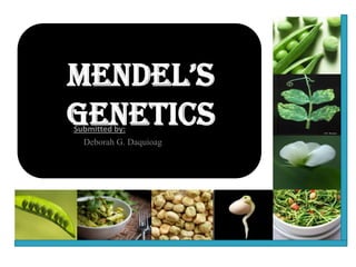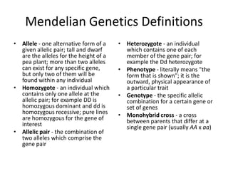 Gregor Mendel conducted experiments with pea plants to study inheritance of traits. He found that traits are passed from parents to offspring through discrete units called alleles, and that alleles segregate and assort independently during reproduction according to his principles of segregation and independent assortment. Mendel's discoveries established the foundations of classical genetics.