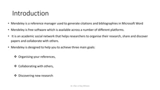Mendeley is a free reference manager and academic social network. It allows users to organize research papers, collaborate with other researchers, and discover new research. Mendeley can import papers from online databases and PDF files, organize them into a personal library, generate citations, and sync the library across devices. It has desktop, web, and mobile apps to access references from anywhere.