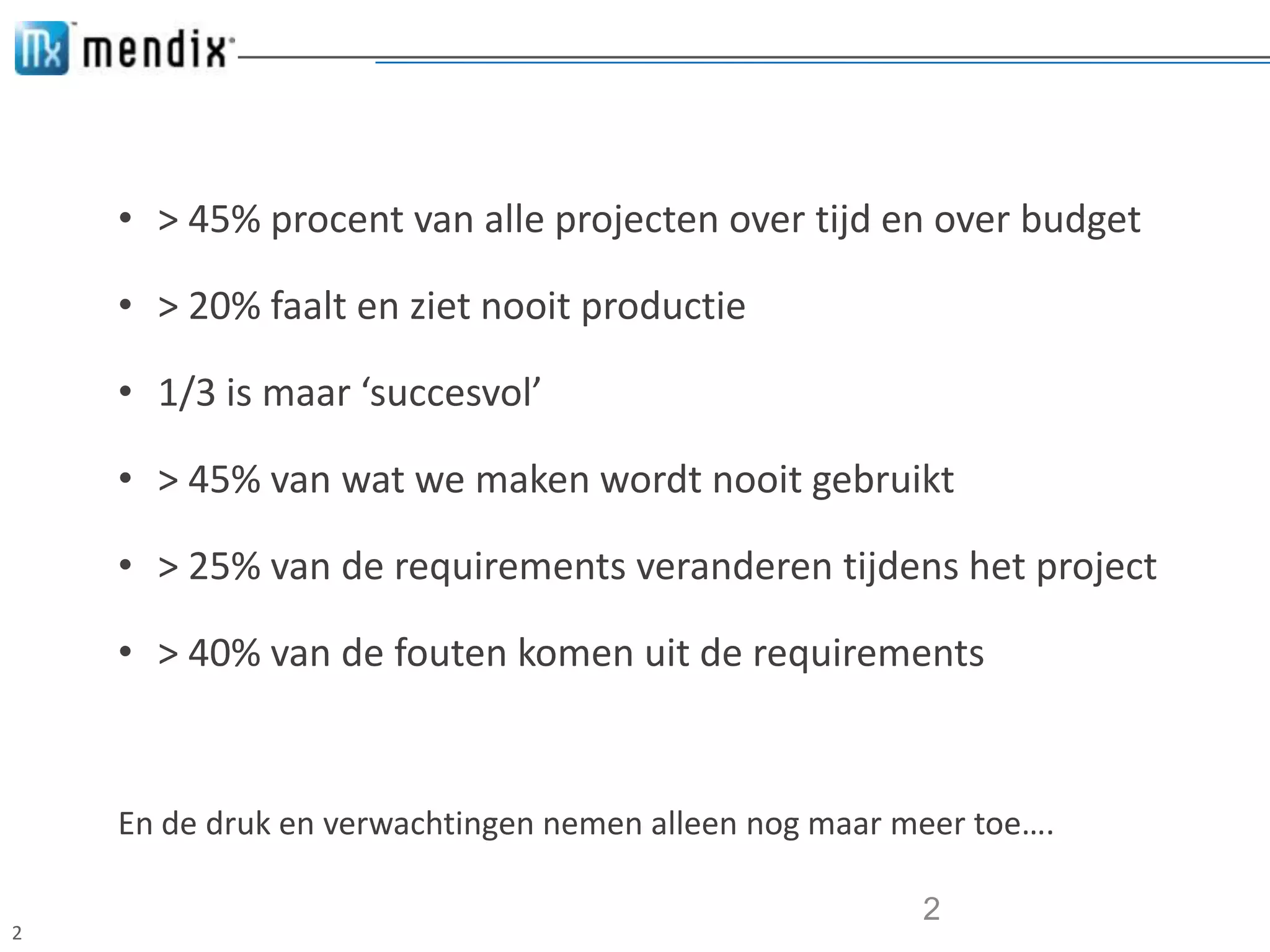 The document discusses the high failure rates of software projects, citing that over 45% of projects are late and over budget, while 20% fail entirely. It highlights three main reasons for project failures, including lack of user involvement, incomplete requirements, and changing requirements. Mendix aims to bridge the gap between business and IT, providing a rapid application development platform that supports collaboration and flexibility throughout the software development lifecycle.