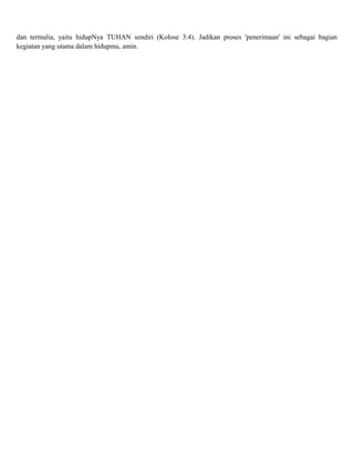 Dokumen ini membahas pentingnya penerimaan dalam memahami Firman Tuhan. Faktor utama untuk memahami Firman Tuhan adalah penerimaan, bukan rasio. Dengan penerimaan, mata pengertian kita akan terbuka untuk menerima pencerahan dari Roh Kudus. Penerimaan ini berarti menerima apa yang sudah diselesaikan Tuhan untuk kita, seperti pengampunan dosa, dan taat pada perintah-Nya seperti lar