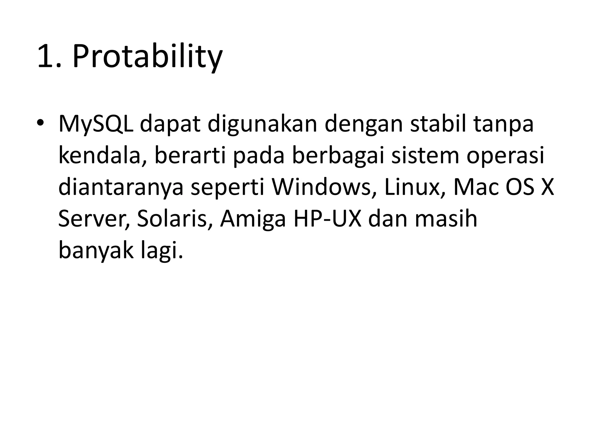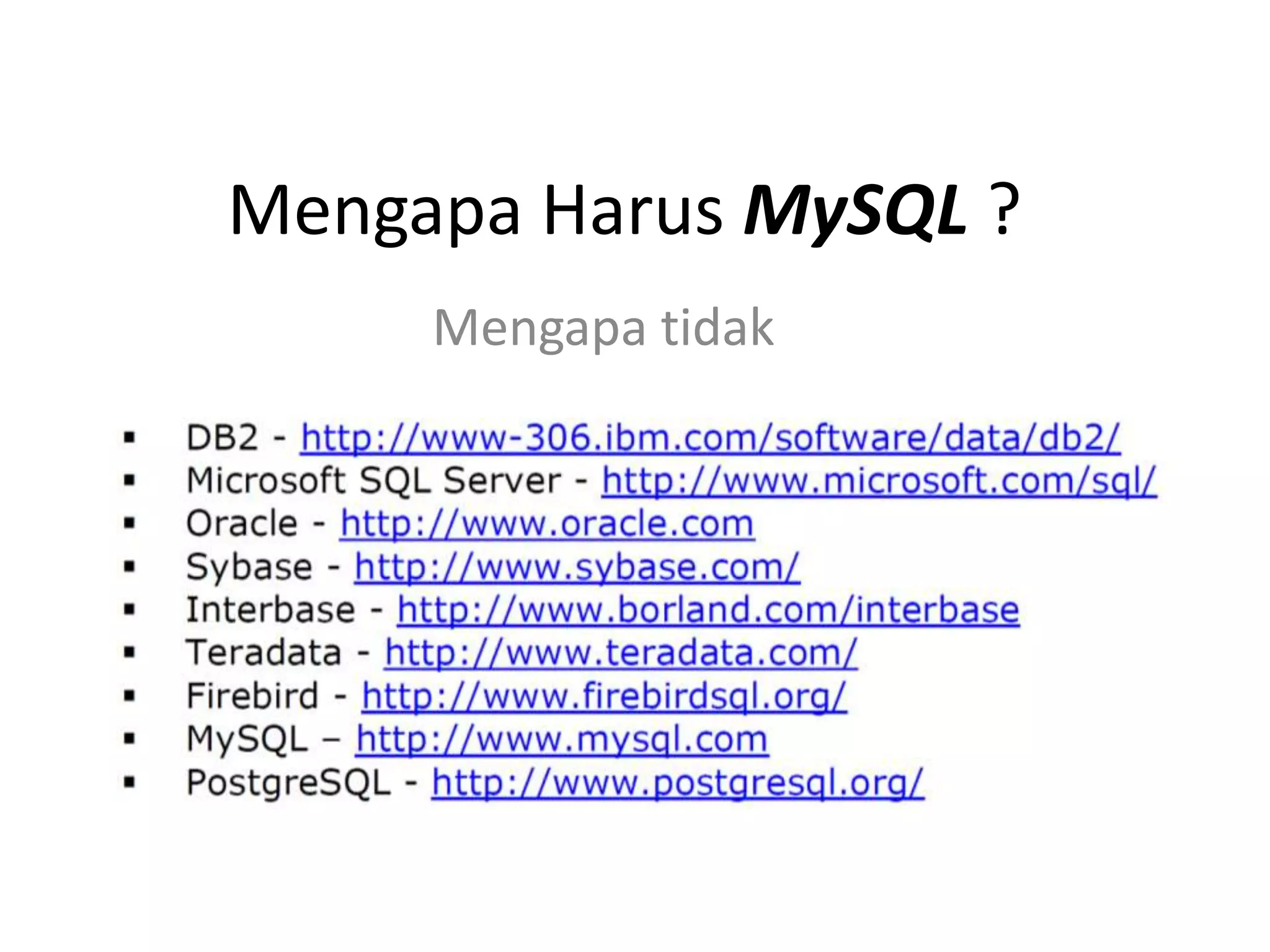 MySQL adalah sistem manajemen basis data yang portabel, open-source, dan mendukung multiuser, memungkinkan akses simultan tanpa konflik. MySQL memiliki kinerja tinggi dalam menangani query dan mampu menangani database besar dengan batas kemampuan yang mengesankan. Selain itu, MySQL menawarkan berbagai tipe kolom, fungsi, dan antarmuka yang fleksibel untuk integrasi dengan aplikasi lain.