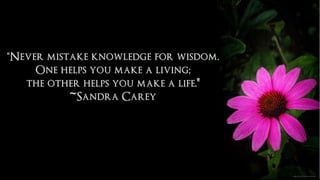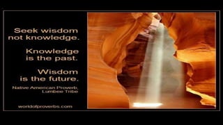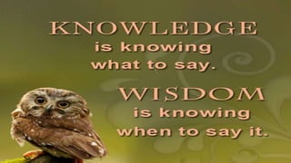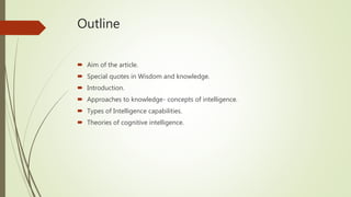 The document discusses different types of intelligence, including cognitive, emotional, and spiritual intelligence. It argues that true wisdom involves balancing knowledge with an understanding of one's own ignorance. Cognitive intelligence involves abilities like analytic, creative, and practical intelligence. Emotional intelligence encompasses self-awareness, self-management, social awareness, and relationship management. Spiritual intelligence allows one to find meaning and question assumptions. The document concludes that developing wisdom requires balancing knowledge with recognizing the limits of what is known.